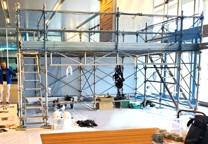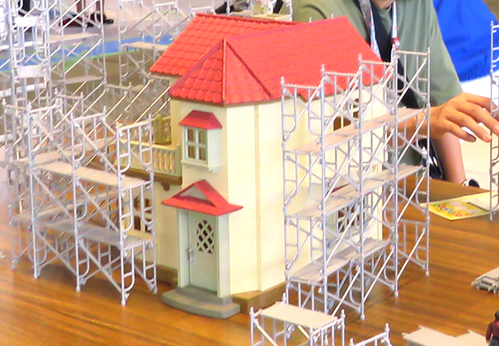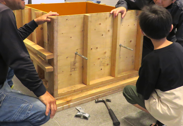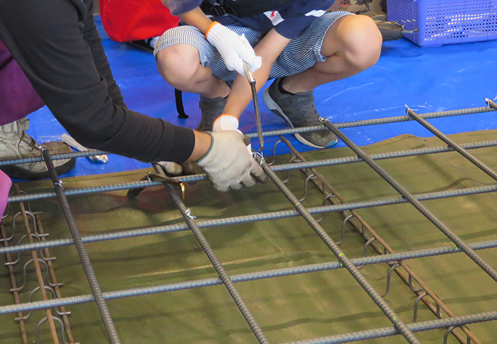 ハッカーを使い、鉄筋資材を結束線で縛って組立